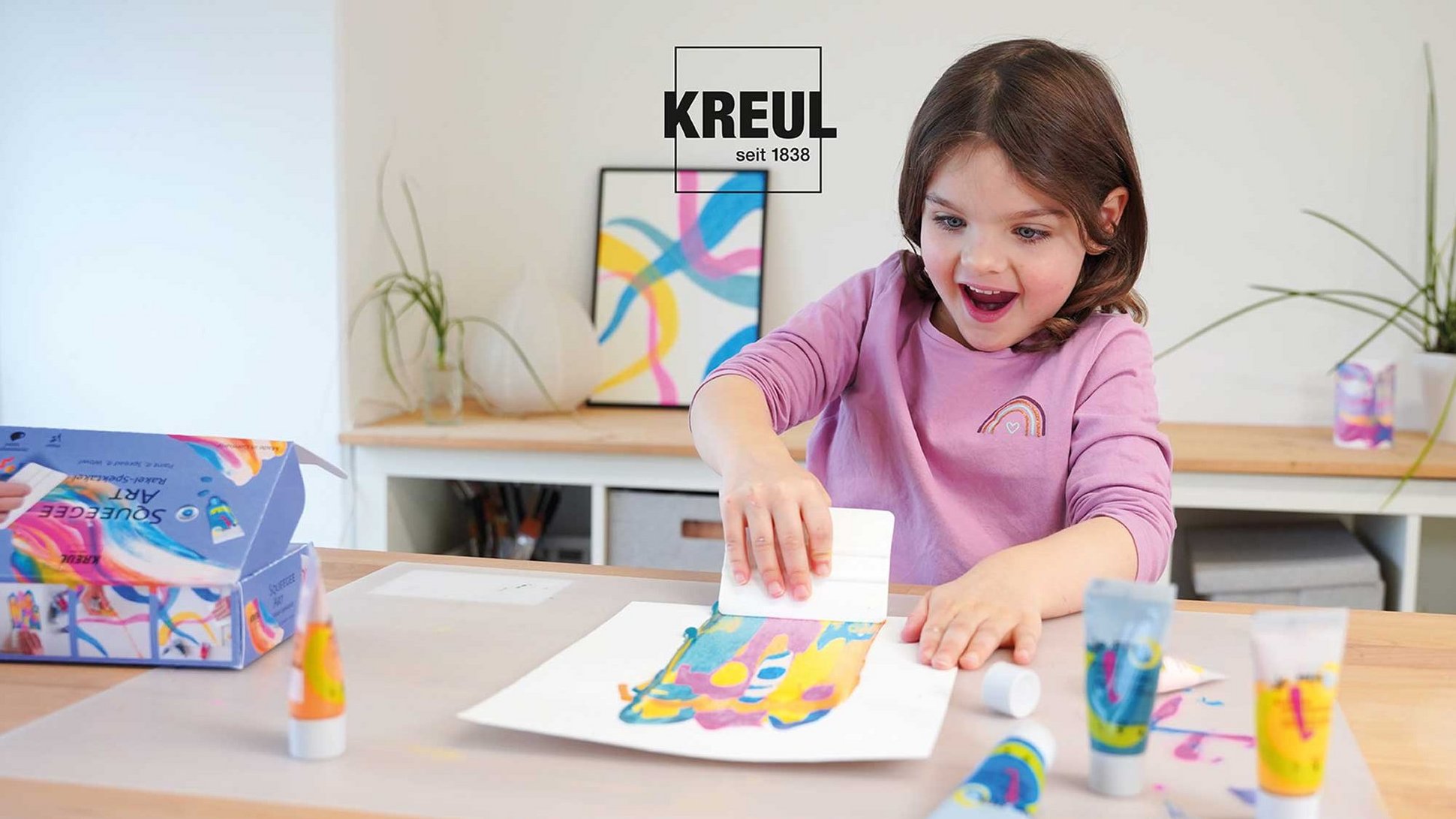 Mit dem KREUL Squeegee Art Set entstehen kunterbunte Farbverläufe und effektvolle Muster, die jedes Mal anders aussehen. Einfach mit dem Rakel wischen – fertig! Die hochpigmentierten KREUL Kids Art Kinder-Künstlerfarben sind Made in Germany, leuchten brillant und lassen sich perfekt mischen. Und weil sie auswaschbar sind, darf auch mal gekleckst werden.