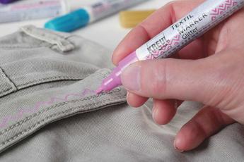 - This is how it works: wash textiles free of finishes and fabric softener before painting. Place baking paper between the layers of fabric for protection. Shake the KREUL Textile Marker Glitter vigorously with closed cap for 1 to 2 minutes before each application. By carefully pressing the tip onto the paper several times, ink is pumped until it becomes visible. After a drying time of 6 hours, cover the painted fabric with baking paper and fix it with the iron on the cotton setting for 5 minutes. Alternatively, set the fabric for 8 minutes at 150 °C in the oven. Painted textiles washable inside out up to 40 °C on the delicate cycle.
