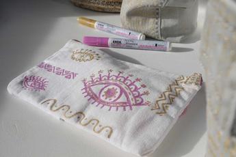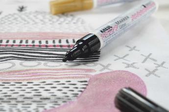- So geht’s: Textilien vor dem Bemalen appretur- und weichspülerfrei waschen. Zum Schutz Backpapier zwischen die Stofflagen legen. KREUL Textil Marker Glitter vor jeder Anwendung mit geschlossener Kappe 1 bis 2 Minuten kräftig schütteln. Durch mehrmaliges, vorsichtiges Drücken der Spitze auf Papier wird Farbe angepumpt bis diese sichtbar wird. Den bemalten Stoff nach einer Trockenzeit von 6 Stunden mit Backpapier abdecken und mit dem Bügeleisen bei Baumwolleinstellung 5 Minuten fixieren. Alternativ im Backofen den Stoff 8 Minuten bei 150 °C fixieren. Fixierte Textilien linksseitig bis 40 °C im Feinwaschgang waschbar.