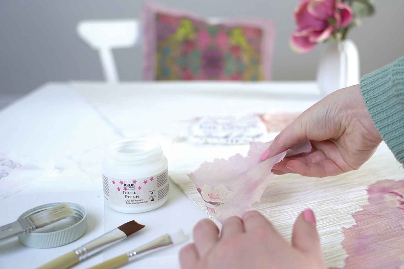 - So geht’s: Potch auf die Stofffläche satt auftragen. Oberste, bedruckte Serviettenlage auflegen, glatt streichen und überlackieren. Nach einer Trockenzeit von ca. 24 Stunden im Backofen 8 Minuten bei 150 °C fixieren. Alternativ durch linksseitiges Bügeln mind. 5 Minuten fixieren