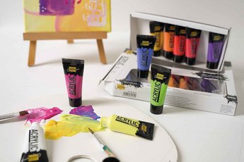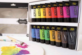 16 Tuben à 20 ml in Weiß, Zitron, Kadiumgelb, Echtorange, Echtrot, Zinnoberrot, Magenta, Violett, Primärblau, Ultramarinblau, Gelbgrün, Permanentgrün, Lichter Ocker, Goldocker, Dunkelbraun, Schwarz